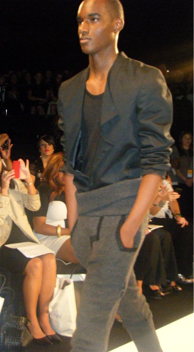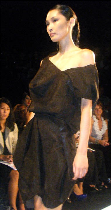 My next favorite was April Howard. A designer who actually started as a designer of home, tabletop, giftware and linens for Tommy Hilfiger and Ralph Lauren. Her inspiration for this collection was found objects sculptor, Kathy Kelley and Cormac McCarthy’s 2006 novel “The Road”. Her shapes do remind me of Kathy Kelley’s work with old tires, the way she manipulates the tough material to curve and bend. April’s off the shoulder dress (the third photo) is absolutely gorgeous, though its leather, she makes the fabric seem light and flowy.