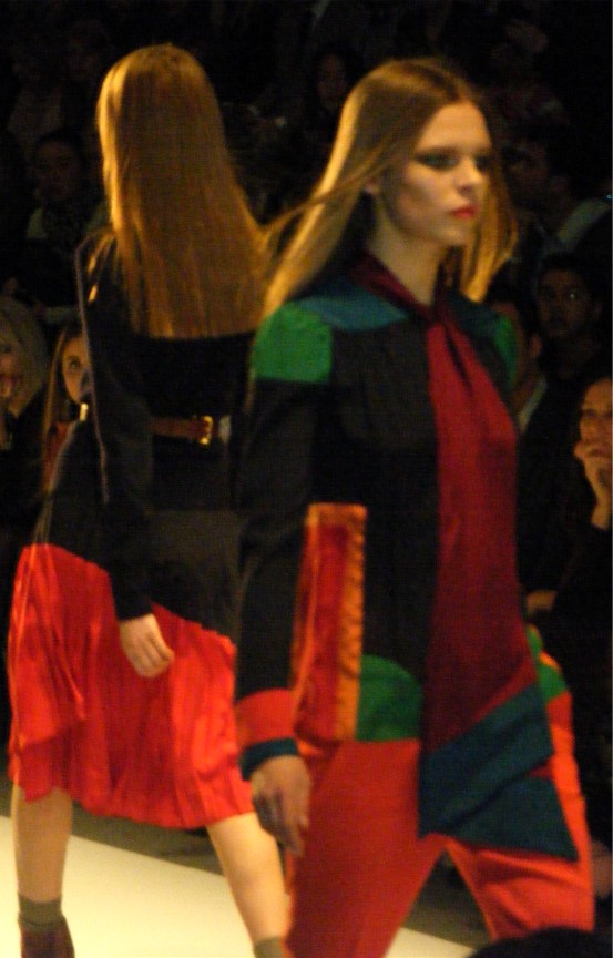 My favorite Jill Stuart looks from this season’s show were her color-block pieces. She featured bold geometric color blocking in striking combinations – teal/green/black, burgundy/orange/teal/black, etc