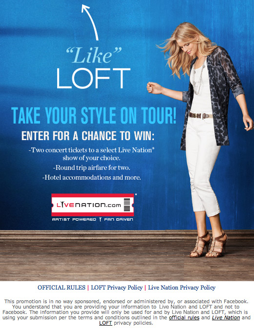 ATTENTION MUSIC LOVERS!! LOFT is doing an amazing contest with Live Nation! All you have to do is Like LOFT on Facebook and enter for a chance to win 2 tickets to a select show of your choice! In addition, the winner will receive round trip airfare and hotel accommodations. How fabulous is that!
