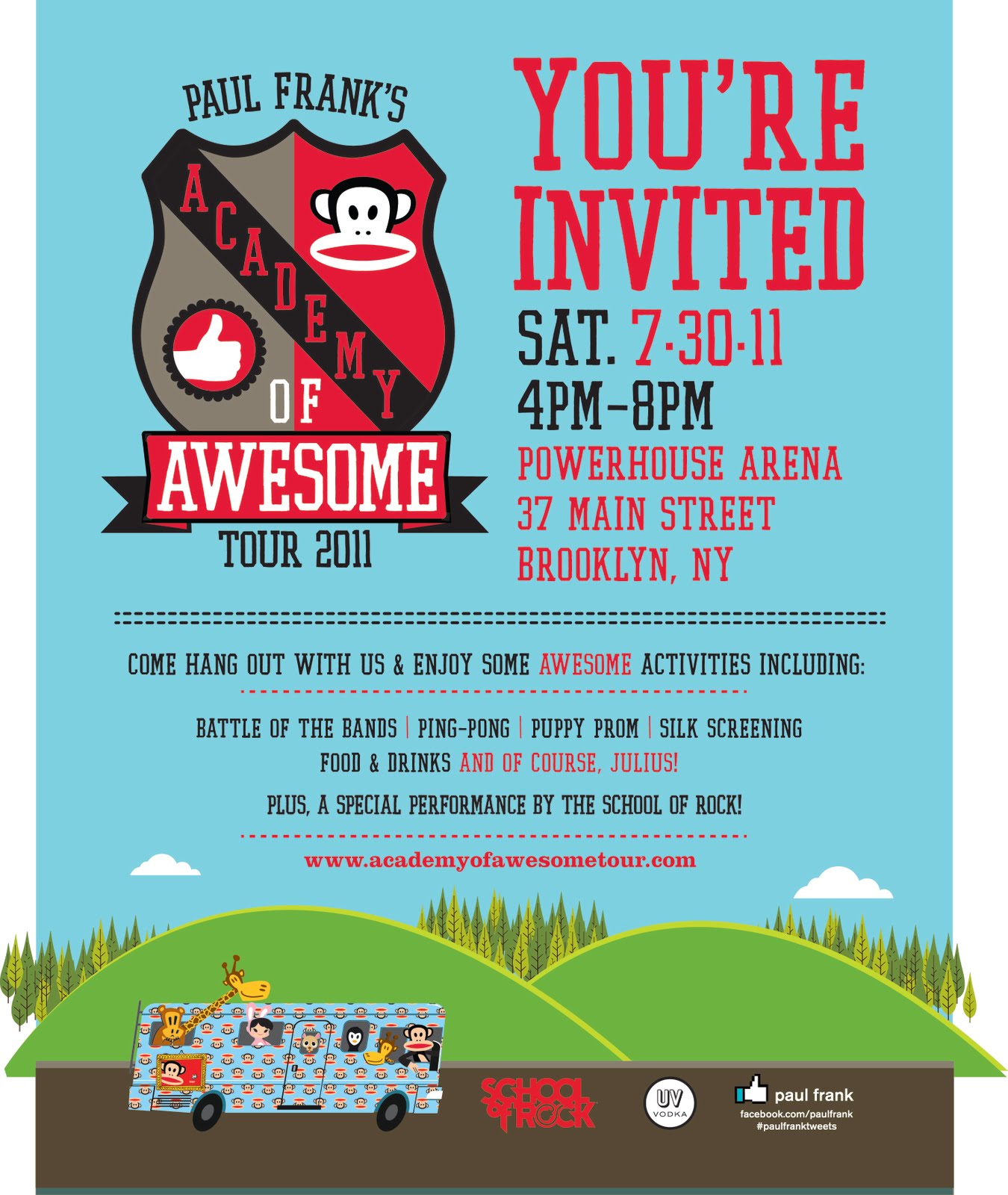 Come one, come all!! Paul Frank is hosting a kickoff event in honor of their Paul Frank’s Academy of Awesome Mobile Tour. The event will be held tomorrow, July 30th from 4 – 8pm at the Powerhouse Arena (located at 37 Main Street) in the Dumbo, Brooklyn. The New York tour stop is going to be fun for the whole family featuring food and drinks, a Creation Station – custom screen printed tote bags station, Skurvy’s Temporary Tattoo Parlor, celeb attendees and a Battle of the Bands with LIVE music!