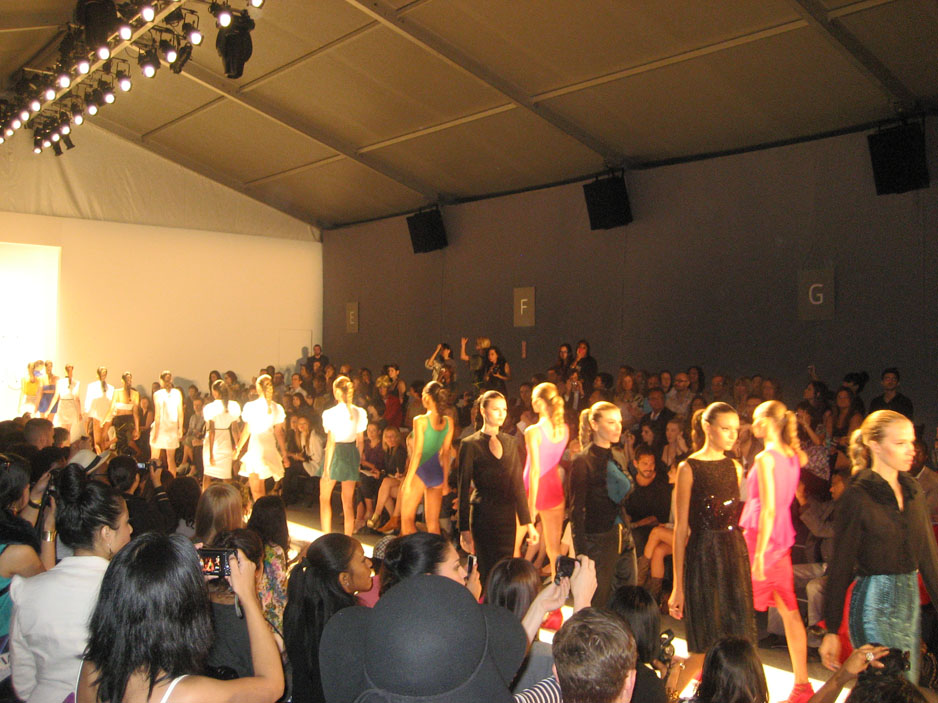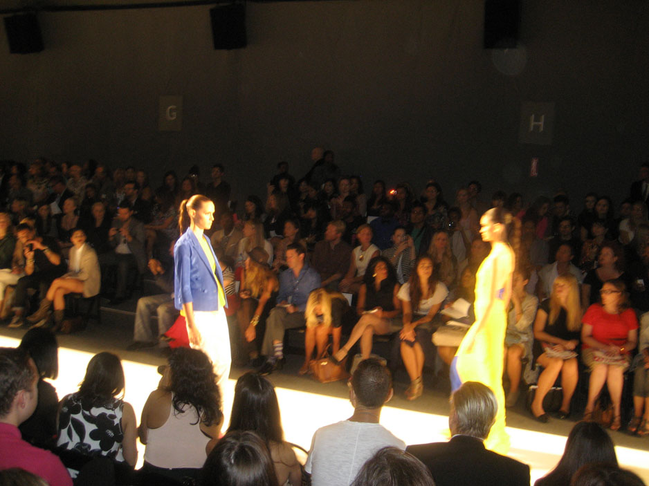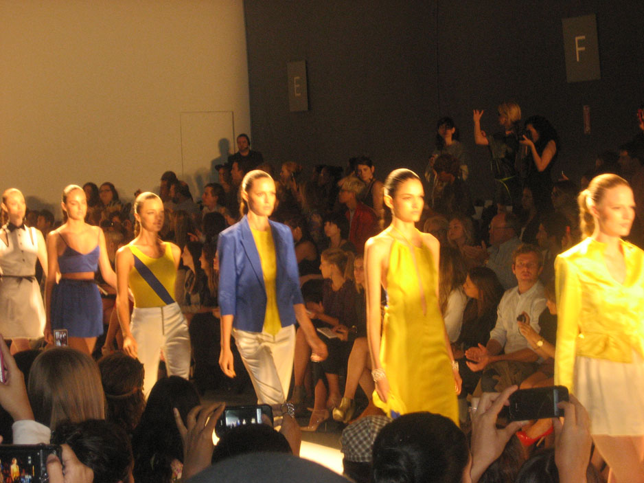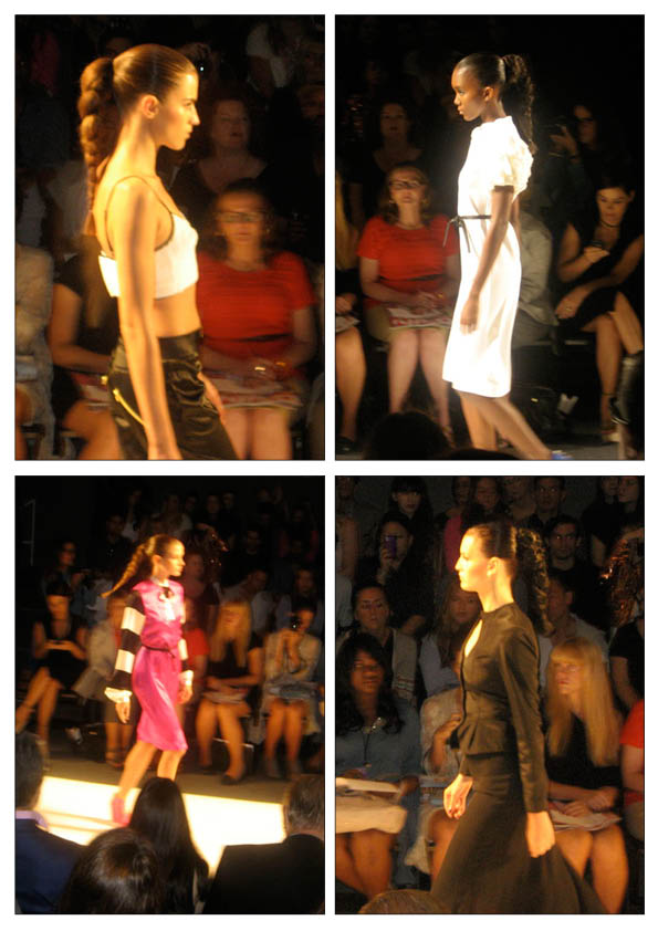 The Spring 2012 show for Ruffian titled “Thoroughbred” featured feminine fabrics and bright coloring with a sharp edge. Color blocking at various angles provided a sense of whimsy for the collection, making predominantly black pieces feel more more lighthearted. Playing on the femininity, models were styled in sleek ponytails.