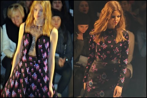 The darker hued looks (which included bordeaux, chocolate, grape, navy, etc) featured dark floral prints and an interesting print consisting of a trio of paint splotches), muted colors, sheer and lace inserts, rhinestones which were placed in amazing swirled designs on sheer dresses and blouses and turtlenecks – several of which were layered under dresses.