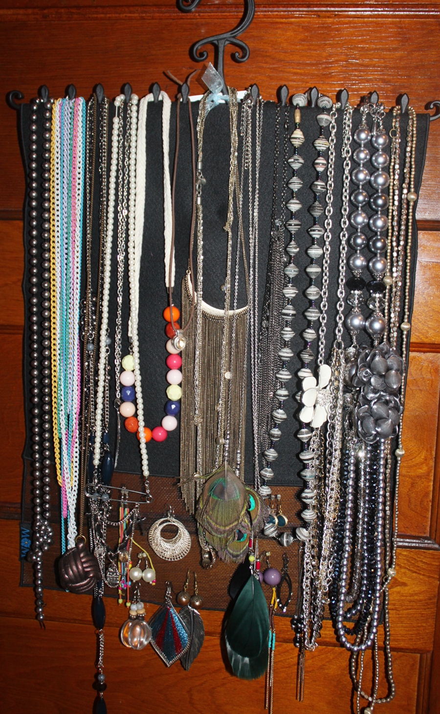 Because of this amazing little invention, my jewelry has become a bit more organized. I actually need another one because I have so many necklaces but the Wow Jewelry Hanger already has me off to a great start. Not only do they save space, they beautifully display your jewelry, making it easy to see at a glance.. I went from this scattered mess (below is just a tiny percentage of the various places I have my jewelry hanging – I admit I made it look neat)