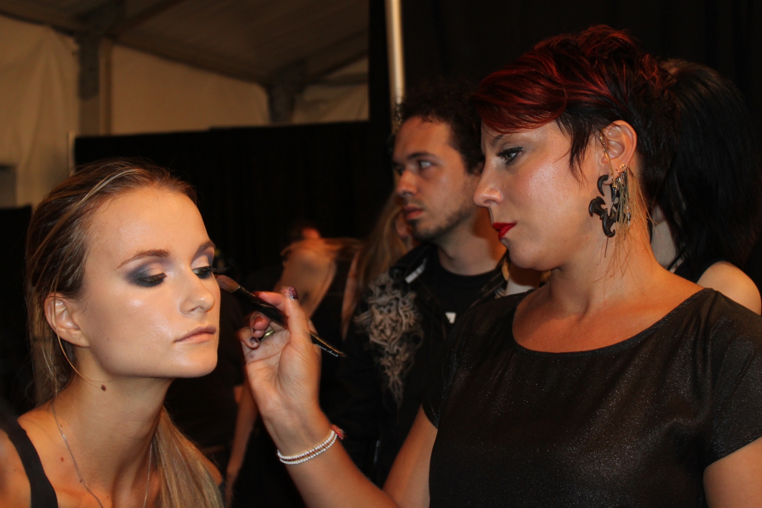 Lead Makeup artist, Dani Fonseca (shown below going over the look with the show’s makeup artists) created a look for Venexiana that was all about the eyes – smoky, dramatic and strong, a perfect compliment to Kati Stern’s glamourous and edgy collection while lips stayed soft and subtle