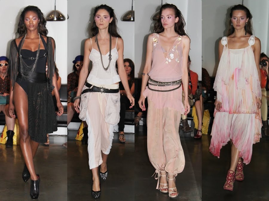 Silk chiffons dominated the collection in sensual flowing looks, leather strips and harnesses (a hot item this season) showed an edgier, sexier side to the collection which featured lots of muted colors found in the ocean (seaweed, coral, foam, sand, etc) peppered with a few black pieces and accessories.
