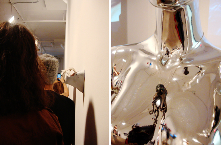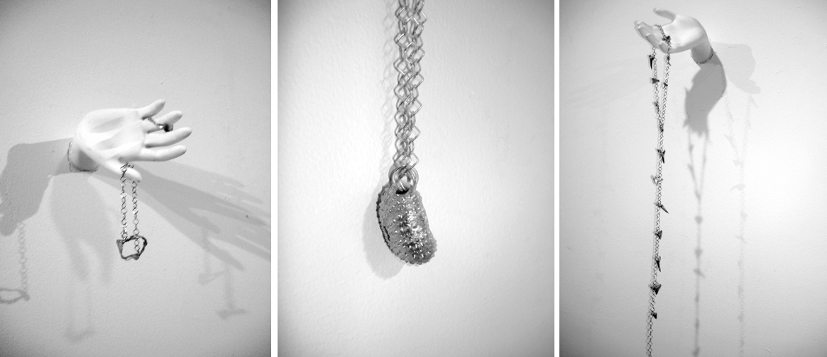 A gold ring shaped like a sea horse wound its way around a plaster thumb, both whimsical and sensual – the type of ring you would turn around on your finger in endless play, all day long. A long silver chain, adorned with tiny teeth, was a nice counterpoint to a delicate silk blouse, and perfect with a jacket and bare skin. I particularly adored the sea cucumber pendant and the octopus necklace (shown in the last photo below)